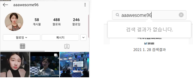 아이디는 @aaawesome96 으로 인스타를 했었는데, 관심을 많이 받았는지 부담되었는지 현재는 없어졌고, 새로운 계정으로 인스타그램을 하고 있습니다.