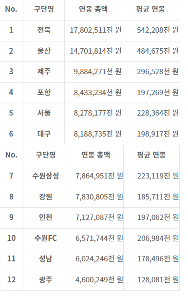 K리스 선수 중 연봉 1위는 전북 김보경 선수로 13억이죠. 5위를 보면 윤빛가람 선수 10억 6400만원정도가 됩니다.