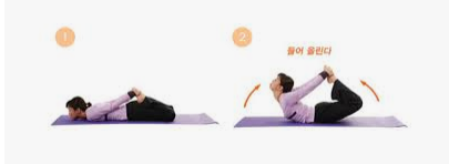 편안한 자세로 엎드려서 손으로 발목, 발등, 발 을 잡아줍니다. 발 사이나 무릎사이의 간격은 골반 만큼 벌려주고 숨을 들이 마시면서 다리를 당겨서 쭉 들어올려주고 30초 정도 유지합니다.