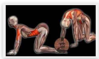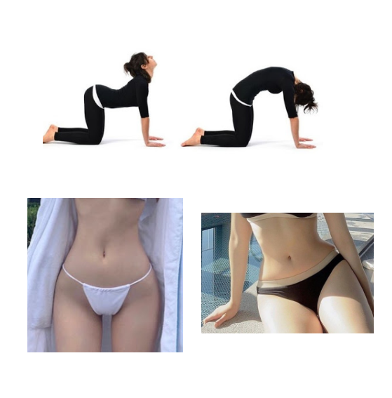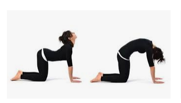 양손과 무릎은 어깨 넓이 정도로 바닥을 짚어주시고, 고개를 뒤로 젖히면서 숨을 들이마시며 엉덩이또한 하늘로 향하게 해줍니다.  숨을 내뱉으며 머리를 숙이고 어깨와 등을 말아서 복부를 당겨 허리를 하늘위로 들어주는 자세를 취합니다.