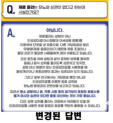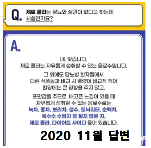 2020년 11월 대한당뇨병학회의 답변은 제로콜라와 당뇨는 상관이 없다 라고 하였습니다. 당시 다른 식품들과 비교 시 열량이 비교적 적어 혈당에는 큰 영향을 주지 않다고 답변을 했었는데요.