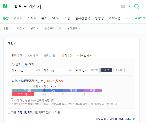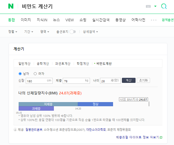 다음포털에서도 비만도 계산기가 있습니다. 하지만 남자 여자 등의 구분이 없네요.