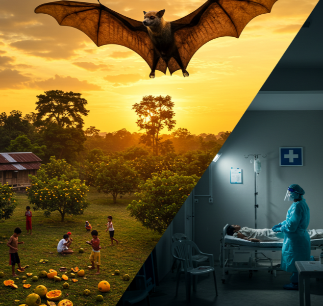 이 바이러스는 감염 동물의 소변이나 침에 오염된 과일이나 수액을 섭취하거나, 병든 돼지와 같은 증폭숙주와의 접촉을 통해 전염됩니다. 현재 WHO에 의해 생물안전 4등급 병원체로 분류되어 있으며, 인수공통감염병이자 팬데믹 가능성이 높은 고위험 병원체로 지정되어 있습니다.