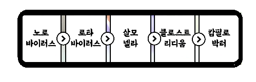 노로바이러스 : 해산물 덜 익힘 (가장 흔하고 감염력이 높음) 토하다가 비말 감염으로 옮기도 합니다.