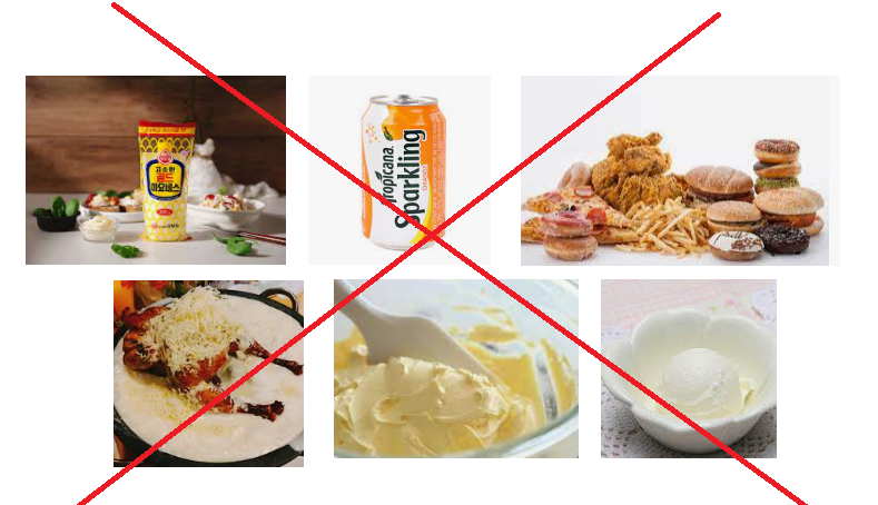 제일 중요한 식습관을 고쳐야합니다. 식단계획을 잘 세워서 되도록이면 식사에서 버터나 크림, 치킨, 탄산음료, 마요네즈 등의 섭취를 줄여주시는게 좋습니다.