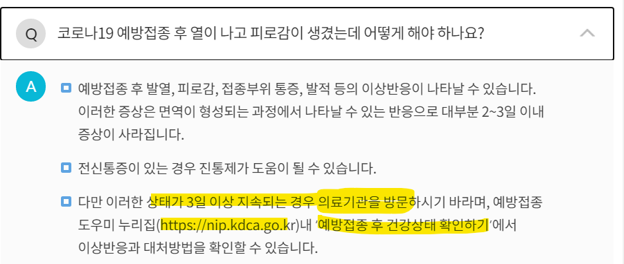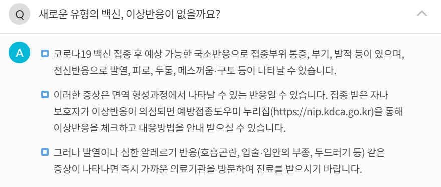 질병관리청 코로나19예방접종.kr 사이트에 제공하는 백신의 안정성 및 이상반응 및 대처법