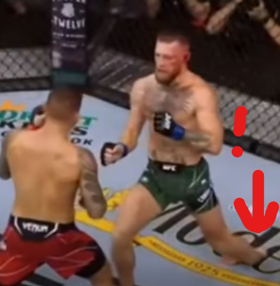 맥그리거의 오니쪽 정강이가 갑자기 꺽이면서 쓰러집니다.